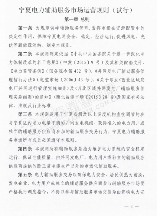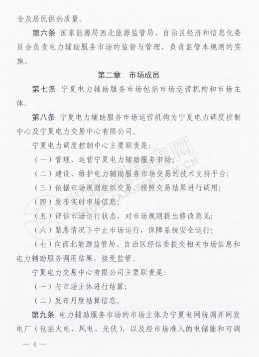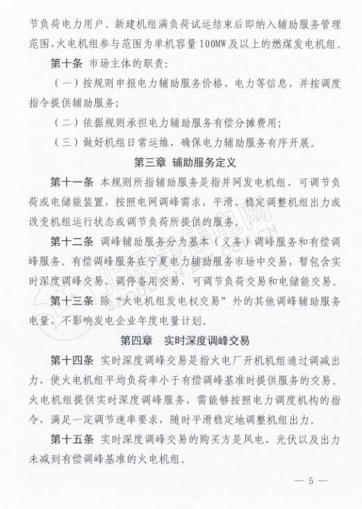 在《寧夏電力輔助服務(wù)市場運(yùn)營規(guī)則》中,規(guī)定電力輔助服務(wù)市場的市場主體為寧夏電網(wǎng)統(tǒng)調(diào)并網(wǎng)發(fā)電廠(火電、風(fēng)電、光伏),以及經(jīng)市場準(zhǔn)入的電儲能和可調(diào)節(jié)負(fù)荷電力用戶。新建機(jī)級組滿負(fù)荷試運(yùn)結(jié)束后即納入輔助服務(wù)管理范圍,火電機(jī)組參與范圍為單機(jī)容量100MW及以上的燃煤發(fā)電機(jī)組。與前不久剛剛發(fā)布的甘肅的電力輔助服務(wù)運(yùn)營規(guī)則中規(guī)定的市場主體相比較,缺少了水電企業(yè)的身影。