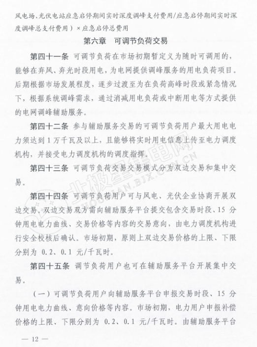 可調(diào)節(jié)負(fù)荷交易模式分為雙邊交易和集中交易兩種。參與輔助服務(wù)交易的可調(diào)節(jié)負(fù)荷用戶最大用戶電力須達(dá)到1萬千瓦及以上。可調(diào)節(jié)負(fù)荷用戶可與風(fēng)電、光伏企業(yè)協(xié)商開展雙邊交易,并規(guī)定了雙邊交易價格的上限為0.2元/千瓦時,下限0.1元/千瓦時。