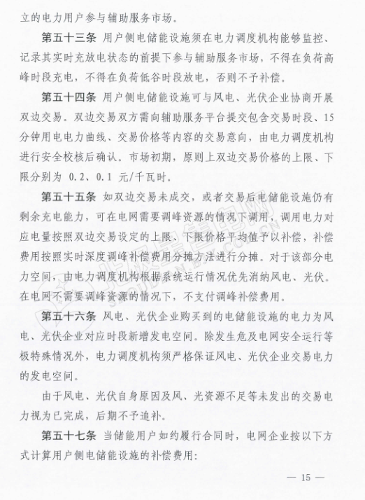 鼓勵發(fā)電企業(yè)、售電企業(yè)、電力用戶、獨(dú)立輔助服務(wù)提供商等投資建設(shè)電儲能設(shè)備,要求充電功率在1萬千瓦及以上、持續(xù)充電時間4小時以上。同樣,電儲能設(shè)施也可與風(fēng)電、光伏企業(yè)協(xié)商開展雙邊交易。交易價格的上限為0.2元/千瓦時,下限0.1元/千瓦時。