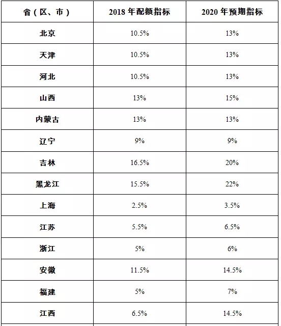 2 、各省級行政區(qū)域2018、2020年非水電配額指標(biāo)
