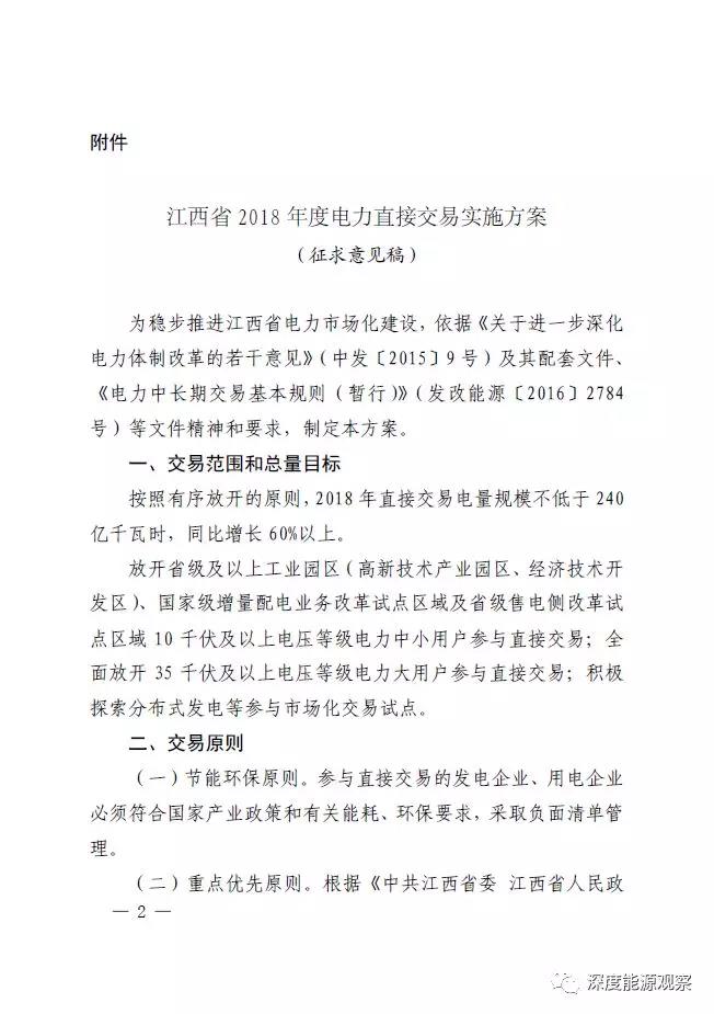 中國(guó)儲(chǔ)能網(wǎng)訊:2月24日,江西省能源局發(fā)布了關(guān)于征求《江西省2018年度電力直接交易實(shí)施方案(征求意見稿)》意見的函。并且附件《江西省2018年度電力直接交易實(shí)施方案(征求意見稿)》,具體內(nèi)容如下: