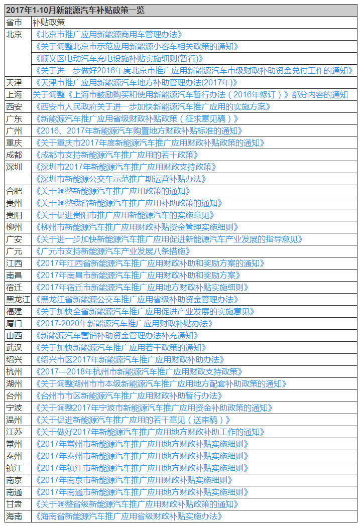 2017年7月,北京、深圳、廣州、重慶、成都、貴陽、貴州、柳州、廣元、廣安、江西、宿遷、廈門13個(gè)省市出臺(tái)了2017新能源汽車補(bǔ)貼政策。