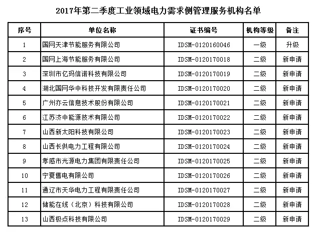 附件:2017年第二季度工業(yè)領(lǐng)域電力需求側(cè)管理服務(wù)機(jī)構(gòu)名單