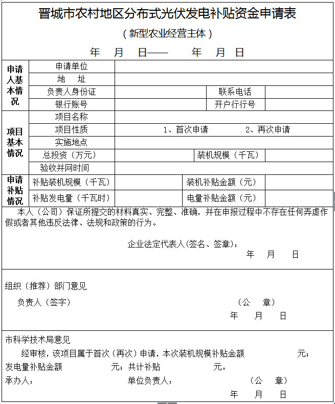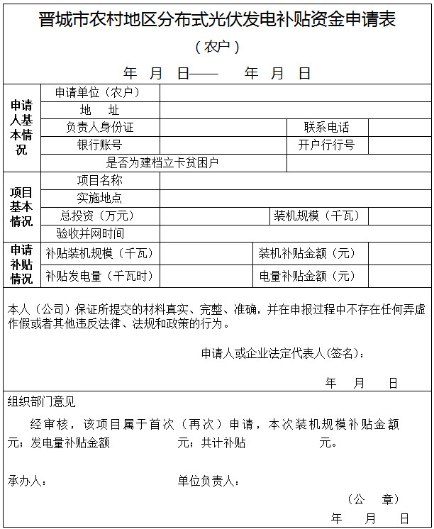 1、《晉城市農(nóng)村地區(qū)分布式光伏發(fā)電補貼資金申請表》。