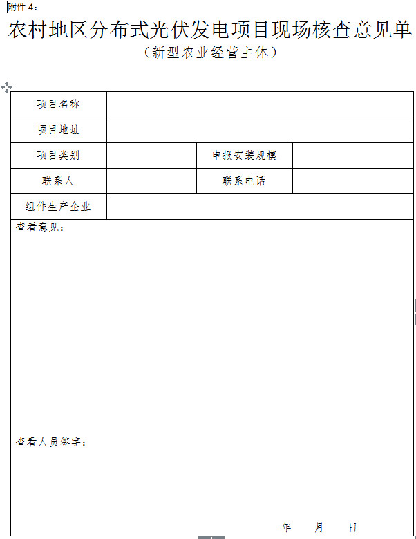 附件4:《農(nóng)村地區(qū)分布式光伏發(fā)電項目現(xiàn)場核查意見單(新型農(nóng)業(yè)經(jīng)營主體)》