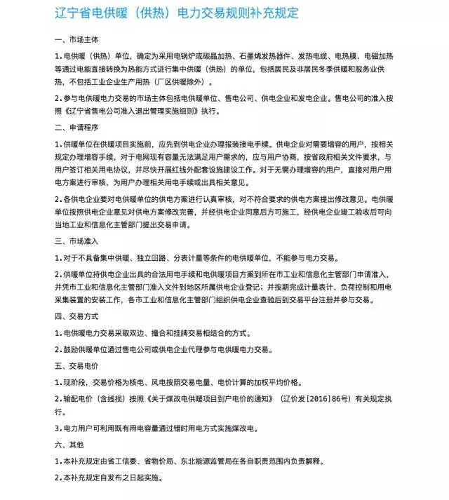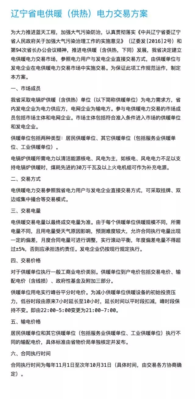 記者了解到,《遼寧省電供暖(供熱)電力交易規(guī)則》是在2016年5月30日印發(fā)的,適用于電力用戶與發(fā)電企業(yè)直接交易,電供暖電力交易參照我省電力用戶與發(fā)電企業(yè)直接交易方式,可采取掛牌、雙邊或集中撮合等交易模式。