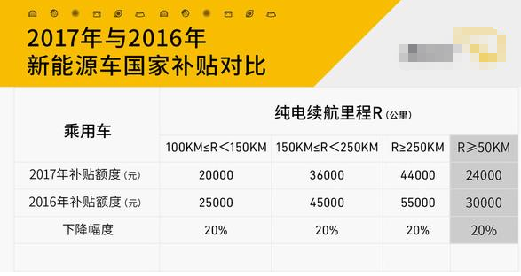 通過上述表格中的數(shù)據(jù)不難發(fā)現(xiàn),2017年新能源車的國家補貼相比2016年的額度降低了20%,而以規(guī)定的標準為例來計算,總補貼的下降幅度則為40%,其中僅從普通地區(qū)的地補來看,按照規(guī)定的地補相比2016年甚至下降了60%(僅供參考,因為每個地方的補貼政策均不同)。