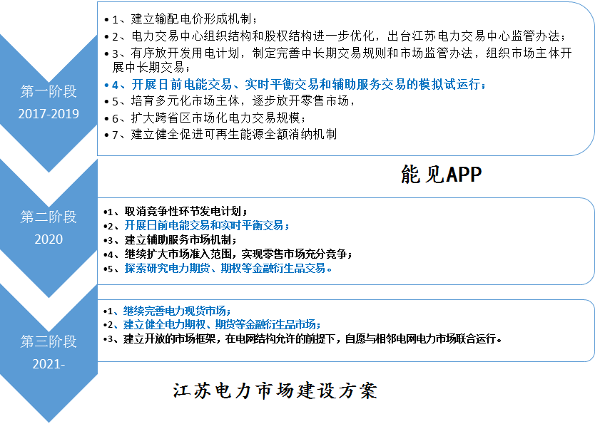 1、建立科學(xué)合理的、與江蘇電力市場相適應(yīng)的輸配電價(jià)形成機(jī)制;2、根據(jù)電力體制改革和電力市場建設(shè)情況,實(shí)現(xiàn)江蘇電力交易中心組織結(jié)構(gòu)和股權(quán)結(jié)構(gòu)進(jìn)一步優(yōu)化,出臺(tái)江蘇電力交易中心監(jiān)管辦法,充分發(fā)揮電力市場管理委員會(huì)議事協(xié)調(diào)作用;3、建立健全電力市場注冊制度;4、有序放開發(fā)用電計(jì)劃,制定有序放開發(fā)用電計(jì)劃工作方案。制定完善中長期交易規(guī)則和市場監(jiān)管辦法,組織市場主體開展中長期交易,逐步擴(kuò)大競爭性環(huán)節(jié)直接交易規(guī)模,通過市場化手段調(diào)節(jié)電力需求變化造成的發(fā)用電量偏差;5、開展日前電能交易、實(shí)時(shí)平衡交易和輔助服務(wù)交易的模擬試運(yùn)行;6、建立有效的市場監(jiān)管機(jī)制、風(fēng)險(xiǎn)防控機(jī)制和信用評(píng)價(jià)機(jī)制;7、培育多元化市場主體,建立售電企業(yè)與電力用戶簽約交易機(jī)制,逐步放開零售市場,促進(jìn)市場有序競爭,自愿參與市場交易的電力用戶原則上全部電量進(jìn)入市場;8、擴(kuò)大跨省區(qū)市場化電力交易規(guī)模;9、建立健全促進(jìn)可再生能源全額消納機(jī)制,根據(jù)上網(wǎng)標(biāo)桿電價(jià)和核定利用小時(shí)數(shù),結(jié)合市場競爭機(jī)制,通過落實(shí)優(yōu)先發(fā)電制度,在確保供電安全的前提下,全額收購規(guī)劃范圍內(nèi)的可再生能源發(fā)電項(xiàng)目上網(wǎng)電量。