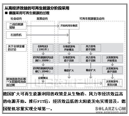 德國(guó)擴(kuò)大可再生能源利用的政策是從生物質(zhì)、風(fēng)力等經(jīng)濟(jì)效益高的電源開始。推行FIT后,經(jīng)濟(jì)效益低的太陽能發(fā)電實(shí)現(xiàn)普及,德國(guó)裝機(jī)容量實(shí)現(xiàn)全球第一。[page]