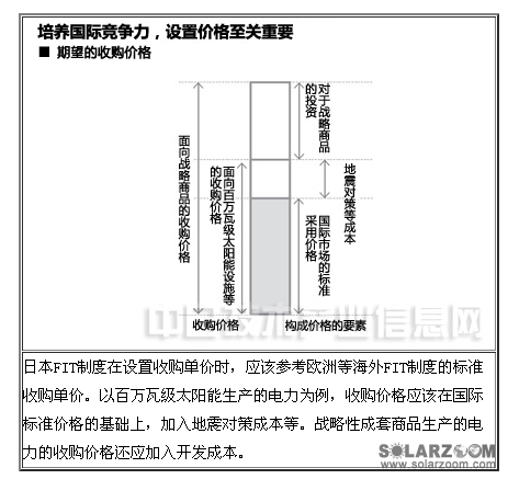 日本FIT制度在設(shè)置收購(gòu)單價(jià)時(shí),應(yīng)該參考?xì)W洲等海外FIT制度的標(biāo)準(zhǔn)收購(gòu)單價(jià)。以百萬瓦級(jí)太陽能生產(chǎn)的電力為例,收購(gòu)價(jià)格應(yīng)該在國(guó)際標(biāo)準(zhǔn)價(jià)格的基礎(chǔ)上,加入地震對(duì)策成本等。戰(zhàn)略性成套商品生產(chǎn)的電力的收購(gòu)價(jià)格還應(yīng)加入開發(fā)成本。