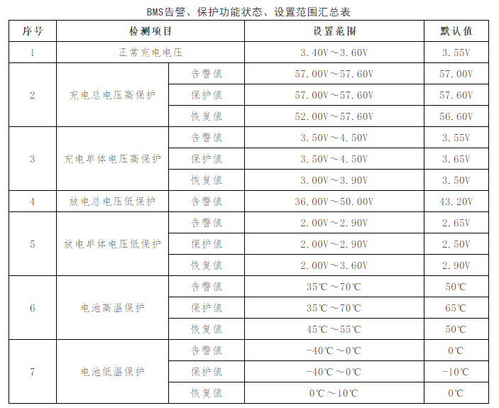 BMS各種檢測(cè)項(xiàng)目的功能狀態(tài)及參數(shù)設(shè)置范圍包括但不限于表中的內(nèi)容。