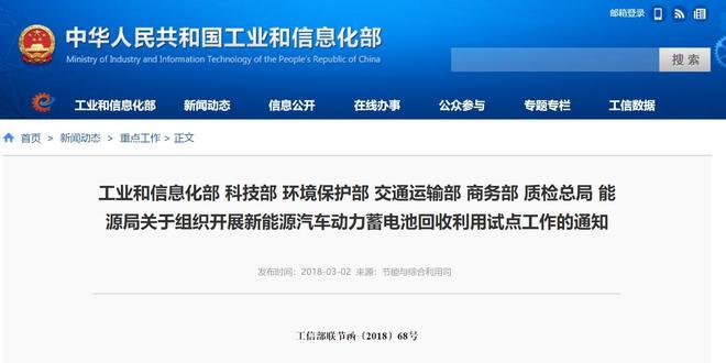 轉過來到2月份,工信部、科技部、環(huán)保部、交通部、商務部、質(zhì)檢總局、能源局印發(fā)《新能源汽車動力蓄電池回收利用管理暫行辦法》的通知,鼓勵汽車生產(chǎn)企業(yè)、電池生產(chǎn)企業(yè)、報廢汽車回收拆解企業(yè)與綜合利用企業(yè)等通過多種形式,合作共建、共用廢舊動力蓄電池回收渠道。