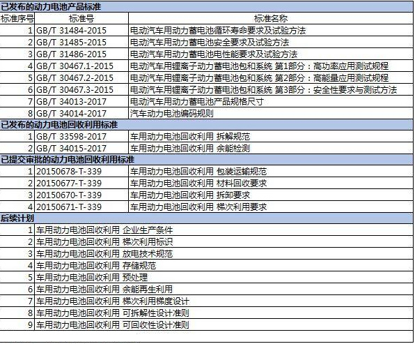 目前,關(guān)于動力電池產(chǎn)品國家標(biāo)準(zhǔn)主要有8項(xiàng),集中規(guī)范了動力電池性能測試要求與方法、動力電池安全性測試要求與方法。關(guān)于動力電池回收利用的標(biāo)準(zhǔn),已發(fā)布的標(biāo)準(zhǔn)有2項(xiàng)、已提交審批的標(biāo)準(zhǔn)有4項(xiàng)目,還有9項(xiàng)后續(xù)計(jì)劃出臺的標(biāo)準(zhǔn)。