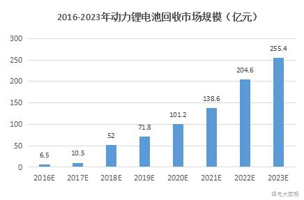 而業(yè)內(nèi)也預(yù)計(jì),從廢舊動(dòng)力鋰電池中回收鈷、鎳、錳、鋰、鐵和鋁等金屬所創(chuàng)造的回收市場(chǎng)規(guī)模在2018年將超過(guò)53億元,2020年將超過(guò)100億元,2023年廢舊動(dòng)力鋰電池市場(chǎng)將達(dá)250億元。