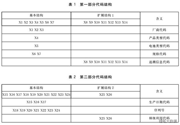 動(dòng)力電池編碼規(guī)則規(guī)定了動(dòng)力電池編碼基本原則、編碼對(duì)象、代碼結(jié)構(gòu)和數(shù)據(jù)載體。