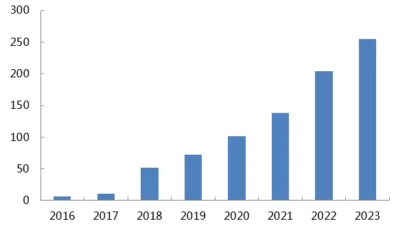 2016-2023年動力鋰電池回收市場規(guī)模(億元)