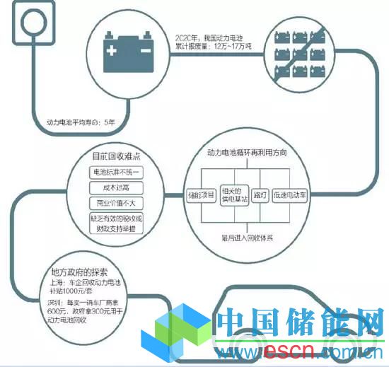 這些不能被電動汽車繼續(xù)使用的電池,并非完全失去了價值,理論上說,它們還可以按照電池容量的不同,而被利用在儲能或者相關(guān)的供電基站以及路燈、低速電動車身上,最后進入回收體系。這也是業(yè)內(nèi)泛稱的動力電池再利用或者是梯次利用。