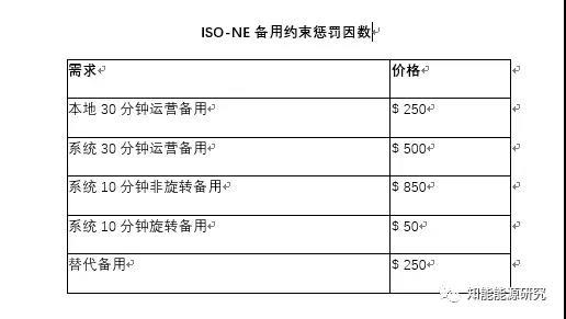 當(dāng)在電能和備用之間需要進(jìn)行取舍時(shí),ISO-NE為創(chuàng)造備用而產(chǎn)生的最大重新調(diào)度成本將限制于備用約束懲罰因數(shù),見下面表。備用約束懲罰因數(shù)也代表了一個(gè)價(jià)格上限,即當(dāng)實(shí)際備用不足時(shí)ISO-NE的支付額。