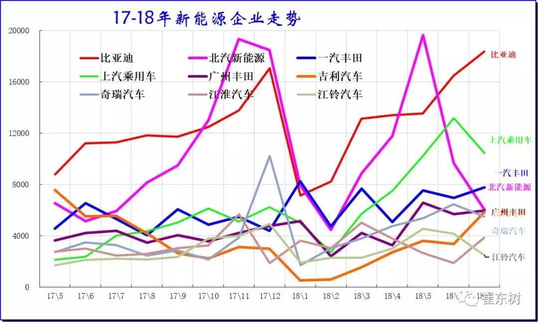 17年的新能源車主要是民營企業(yè)的超強表現(xiàn),眾泰、吉利、比亞迪的表現(xiàn)超強。而北汽新能源和江淮的走勢相對平穩(wěn)。