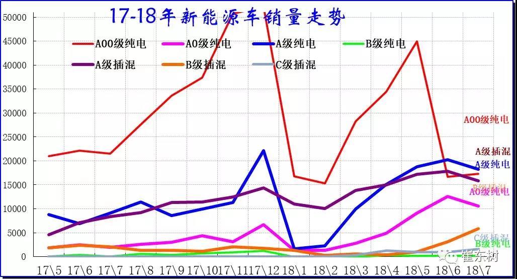 前期的純電動A00級車成為車市的絕對主力車型,增長表現(xiàn)突出。A00級的潛力是巨大的,17年2月開始就體現(xiàn)出較強增長潛力,17年3-7月較高增長,6-7月相對平穩(wěn),8月后快速大幅拉升,11月拉升到5萬臺,體現(xiàn)年末終端市場有效回升的特征。18年1-2月的A00表現(xiàn)平穩(wěn),3-6月的加速上升,7月表現(xiàn)相對調(diào)整,這也是暫時調(diào)整。