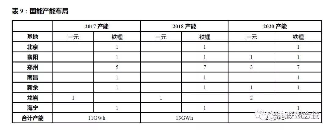 2017年總產(chǎn)能達到11GWh,目前磷酸鐵鋰軟包電池產(chǎn)能占比90%,其余為三元軟包,預計2018年將在鄭州繼續(xù)擴產(chǎn),總產(chǎn)能達到13GWh,公司規(guī)劃2020年總產(chǎn)能升至20GWh,未來國能磷酸鐵鋰電池和三元電池的產(chǎn)量也會根據(jù)市場情況靈活調(diào)整,比例約為6:4。