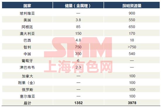 根據(jù)美國地質(zhì)調(diào)查局公布的數(shù)據(jù),世界鋰資源儲量(金屬鋰)總計為1,352萬噸,探明資源量為3,978萬噸。其中世界探明資源量排名前十一位為玻利維亞、智利、阿根廷、美國、中國、澳大利亞、加拿大、剛果(金)、俄羅斯、塞爾維亞和巴西。
