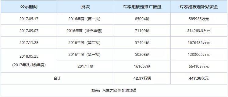 這是2018年工信部的第一輪新能源汽車補貼款的審核公示。在2017年,該部門總共分三批,有21.38萬輛汽車獲批得到257.67億元補貼款。