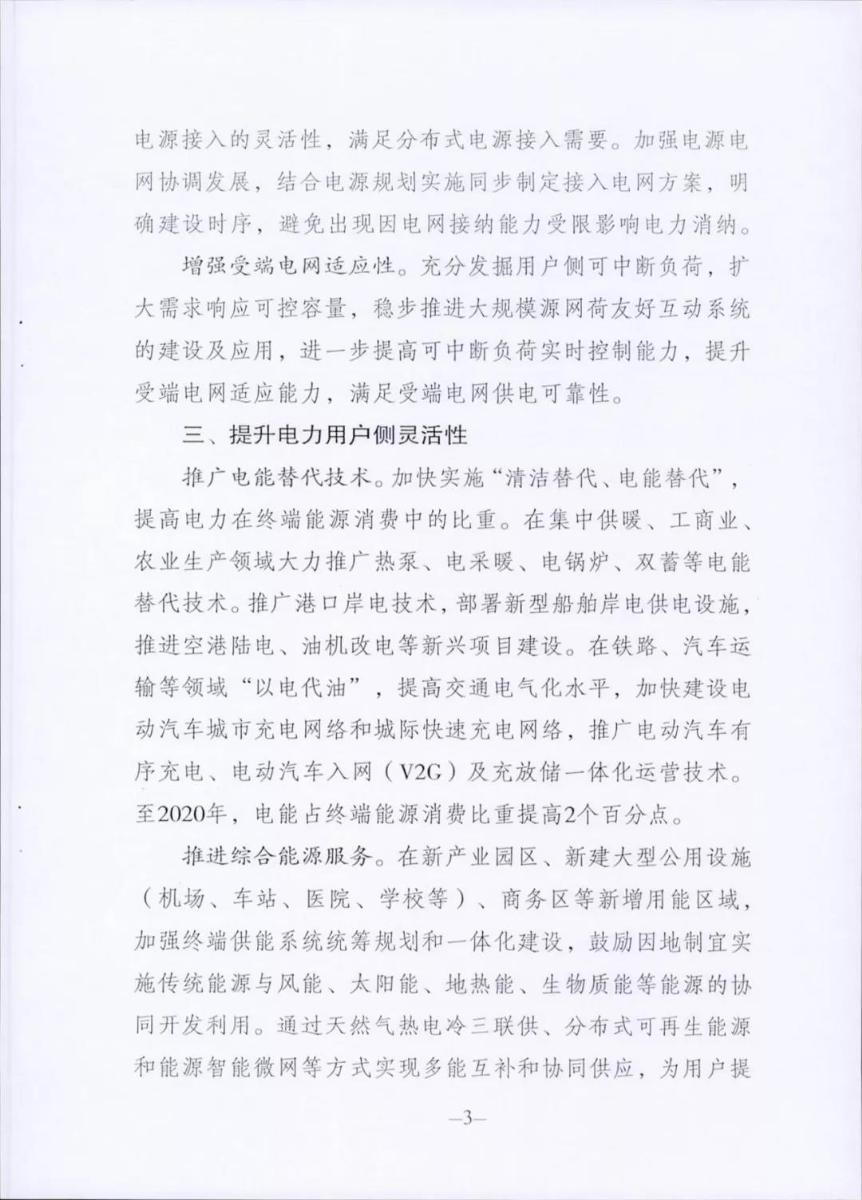 用戶側(cè)將推廣電能替代技術(shù),加快建設(shè)電動汽車城市充電網(wǎng)絡(luò)和城際快速充電網(wǎng)絡(luò),推廣電動汽車有序充電、電動汽車入網(wǎng)(V2G)及充放儲一體化運(yùn)營技術(shù),至2020年,電能占終端能源消費(fèi)比重提高2個百分點(diǎn)。推進(jìn)綜合能源服務(wù),在新產(chǎn)業(yè)園區(qū)、新建大型公用設(shè)施、商業(yè)區(qū)等新增用能區(qū)域,通過分布式可再生能源和能源智能微網(wǎng)等方式實(shí)現(xiàn)多能互補(bǔ)協(xié)同供應(yīng),開展分布式能源市場化交易。