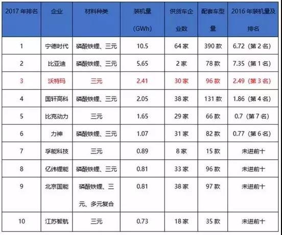 根據(jù)資料統(tǒng)計(jì),占據(jù)2017年國內(nèi)動(dòng)力電池裝機(jī)量排行榜前三的是,寧德時(shí)代、比亞迪和沃特瑪三大企業(yè),具體情況如下表: