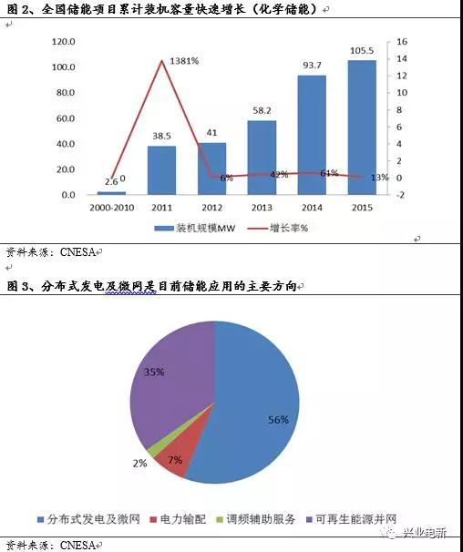 圖2顯示了近年來我國儲能項目累計裝機規(guī)模變化情況圖??梢钥吹剑瑥?011年起我國儲能項目就進入快速發(fā)展的階段。2011年全國儲能項目累計裝機規(guī)模僅為38.5MW,2014年末就發(fā)展到了93.7MW,2015年末累計裝機規(guī)模達到了105.5MW。另外,從儲能項目的應(yīng)用分布方面來看,可以發(fā)現(xiàn),儲能項目在分布式發(fā)電及微網(wǎng)中的應(yīng)用占比高達56%,超過了全國儲能項目的一半以上,可再生能源并網(wǎng)應(yīng)用占比為35%,位居第二。從整體來看,儲能項目應(yīng)用占比較高的仍為用戶側(cè)。
