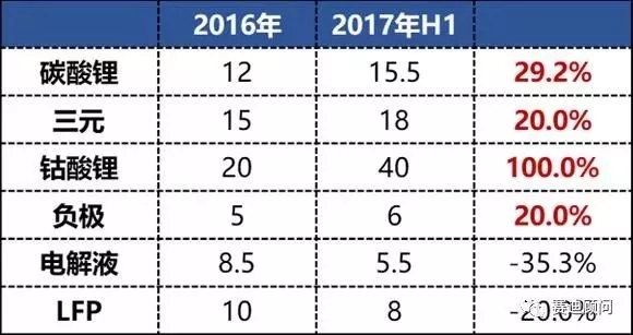 2016年與2017年電池材料價格變化