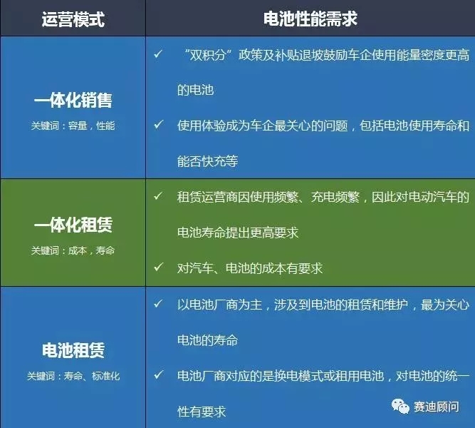 在多樣化的運營模式和使用場景對電池性能也提出了不同要求。一體化銷售的運營模式以車企主導(dǎo)為特點,更關(guān)注電池的容量和性能;一體化租賃則以第三方運營商主導(dǎo),對電池成本和壽命提出了更高要求;電池租賃以電池廠商為主導(dǎo),要求電池的壽命更長、一致性和標(biāo)準(zhǔn)化程度更高。