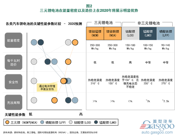 能量密度:在中國,一系列政策文件中指出已經(jīng)對乘用車單體電池的能量密度提出了明確的要求:到2020 年要達(dá)到300Wh/kg;2030年則要求提升至500Wh/Kg。在目前已經(jīng)商業(yè)化的動力電池技術(shù)中,三元鋰電池將會是唯一可能夠達(dá)到2020年國家標(biāo)準(zhǔn)的電池種類,其能量密度優(yōu)勢已被廣泛認(rèn)可。