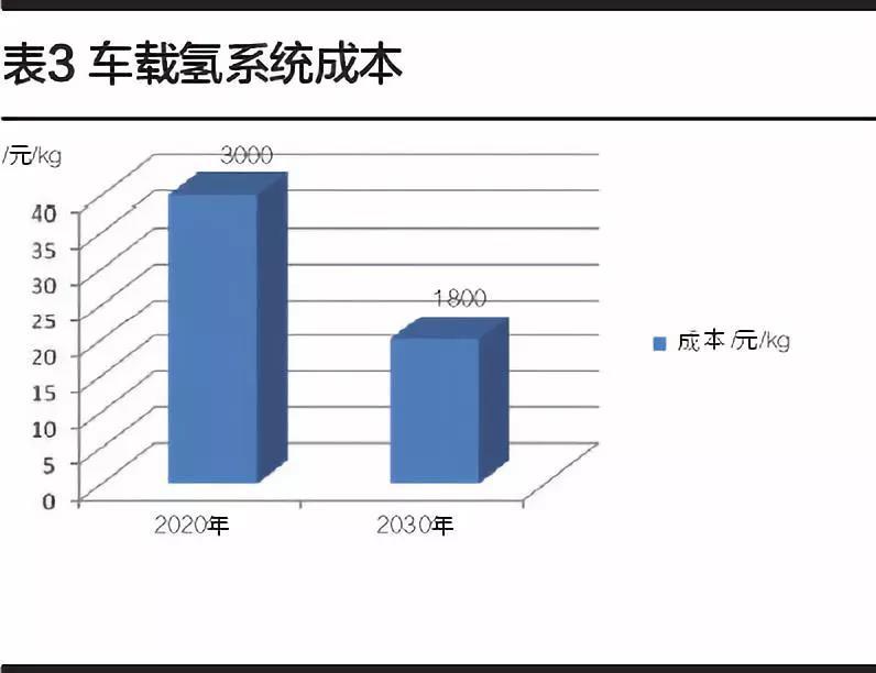 車(chē)載氫系統(tǒng)也是通過(guò)髙度集成化和模塊化設(shè)計(jì),還有關(guān)鍵部件的規(guī)?;蛧?guó)產(chǎn)化生產(chǎn),2020年車(chē)載氫系統(tǒng)的成本可以從3000元/kg降低到2030年的1800元/kg。如果儲(chǔ)存的氫氣是1kg的話,整個(gè)車(chē)載氫系統(tǒng)的成本是1800元。