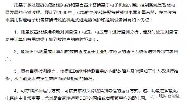 用基于微處理器的智能繼電器和重合器來替換基于電子機(jī)械的保護(hù)控制系統(tǒng)是智能電網(wǎng)發(fā)展的必然過程。預(yù)計(jì)到2030年,70%的饋線都將配備智能繼電器和重合器。在饋線首末端用智能電子設(shè)備替換傳統(tǒng)的機(jī)電式繼電器保護(hù)和控制設(shè)備具有如下優(yōu)點(diǎn):