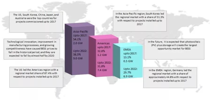 這前五個國家在2017年的累計裝機總量占全球80%以上。在2017年亞太地區(qū)以54.1%的市場份額引領(lǐng)全球市場,其次則是占據(jù)32.8%的美洲,接下來是歐洲、中東,以及非洲。非洲到2017年為止裝機量占據(jù)13.1%。依賴于科技發(fā)展,鋰離子電池已經(jīng)成為目前的首選,到2017為止鋰離子電池在全球電池儲能系統(tǒng)裝機總量份額大約超75%。據(jù)推測鋰離子電池將會是整個研究期間的關(guān)鍵技術(shù)。