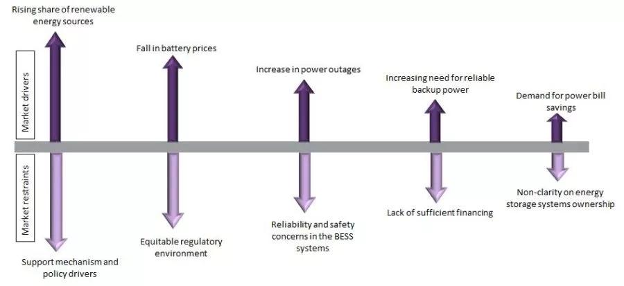 另一方面,電池儲能系統(tǒng)市場正面臨幾項挑戰(zhàn)。例如,合理監(jiān)管環(huán)境的缺失延緩了電池儲能系統(tǒng)項目的發(fā)展。電池儲能系統(tǒng)市場決定于于體制監(jiān)管障礙減少以及公私部門合作的鼓勵政策。目前沒有儲能設(shè)備通用的標準文件,因此每個制造商都可以自由開發(fā)各自的內(nèi)部標準,這導致系統(tǒng)在安裝和維護過程中存在兼容性問題。使用這種在不同公司技術(shù)和制造水平生產(chǎn)的唯一或者定制的備用件,會造成延緩整個工業(yè)經(jīng)濟規(guī)模的影響。應(yīng)制定可促進儲能技術(shù)的國家標準,以加強儲能滲透。這也有利于國家電力提高穩(wěn)定性和可靠性的解決方案。同時,電池儲能系統(tǒng)的可靠性和安全性問題、缺乏足夠資金、支持機制和政策驅(qū)動的缺失、以及儲能系統(tǒng)所有權(quán)的不明晰,都將是未來一段時間內(nèi)阻礙電池儲能系統(tǒng)快速增長的一些因素。