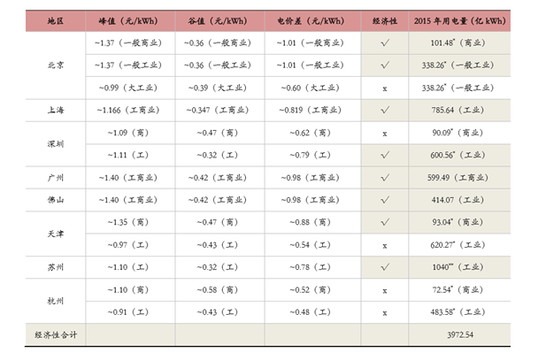 隨著鉛炭儲(chǔ)能度電成本的下降,工商業(yè)企業(yè)用電的削峰填谷應(yīng)用逐漸具有商業(yè)價(jià)值,一般情況下,用電尖峰時(shí)段 約占用電全時(shí)段的 5%,對(duì)應(yīng)尖峰用電量約占總用電量的 20%,這一部分電量存在儲(chǔ)能的商用價(jià)值。特別是部分工商業(yè)發(fā)達(dá)的大型城市,統(tǒng)計(jì)了國內(nèi)大型城市的峰谷電價(jià)差,根據(jù)目前鉛炭儲(chǔ)能最 低 0.5 元左右的度電成本,電價(jià)差大于 0.8 元/kWh 的地區(qū)都有經(jīng)濟(jì)性,這些地區(qū)對(duì)應(yīng)的 2015 年用電量合計(jì)約 為 3972.54 億 kWh,若其中 10%的用電量通過儲(chǔ)能來進(jìn)行削峰填谷,大約需要 1.2 億 kWh 的儲(chǔ)能設(shè)備(其容量對(duì)應(yīng)日 充放電量) ,若按鉛炭儲(chǔ)能每 kWh 約 1250 元的投資額計(jì)算,則對(duì)應(yīng)累計(jì)市場規(guī)模 1500 億元;若按鋰電儲(chǔ)能每 kWh 約 2000 元(考慮未來五年成本有望明顯下降)的投資額計(jì)算,則對(duì)應(yīng)累計(jì)市場規(guī)模 2400 億元。