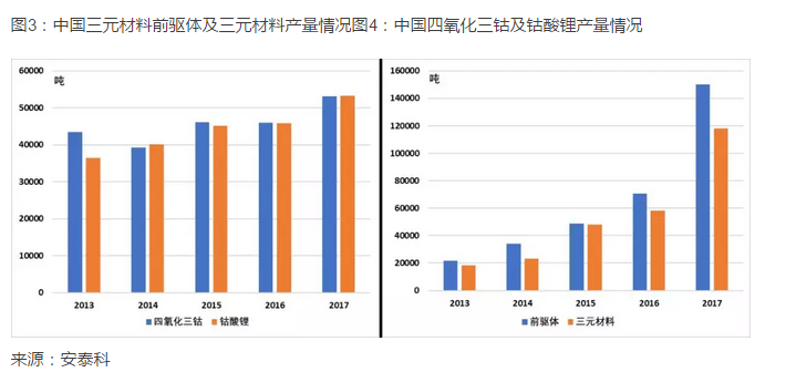此外2017年鈷酸鋰上游原料四氧化三鈷產(chǎn)量達到5.3萬噸,同比增加15.4%,基本與鈷酸鋰的產(chǎn)量增幅相一致。