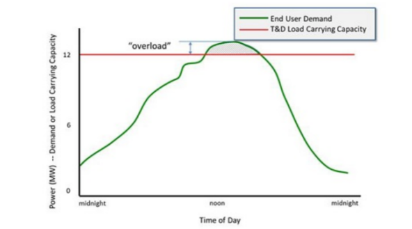 以這種方式考慮,為輸電系統(tǒng)增加更多容量通常需要全面更換電纜和變壓器,以便為輸電系統(tǒng)或配電系統(tǒng)(T&D)上的節(jié)點提供更多電源。采用儲能系統(tǒng)能夠削減該系統(tǒng)的高峰需求,如下圖所示為“過載”,從而允許繼續(xù)使用現(xiàn)有的輸電和配電系統(tǒng)。