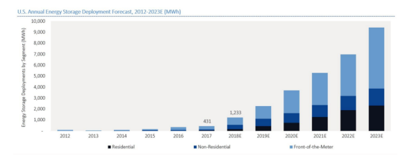 儲能系統(tǒng)作為一種緩沖,能夠吸收和抵消不斷變化的能源供應(yīng)和需求。根據(jù)調(diào)研機構(gòu)GTM公司的統(tǒng)計,2017年美國安裝部署了431兆瓦時的儲能系統(tǒng),預(yù)計2018年將增長三倍,達(dá)到1233兆瓦時。