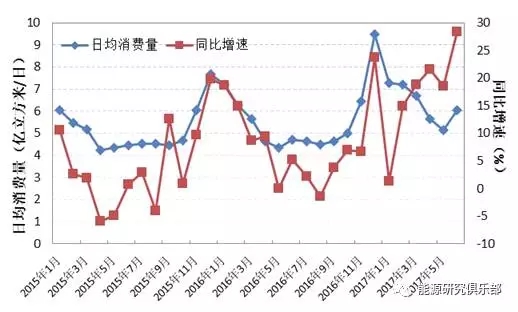 圖3 我國天然氣消費量(2015年1月至2017年6月)