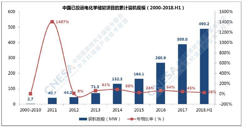 截至2018年6月底,中國已投運電化學(xué)儲能項目的累計裝機規(guī)模為490.2MW,占比為1.6%,相比2017年底上升0.3個百分點。