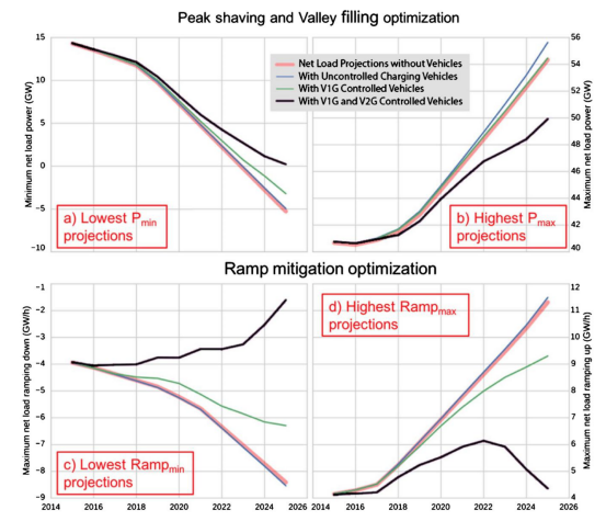通過調(diào)度大量電動汽車在日間充電而不是傍晚充電,將有助于通過儲存剩余電量來平衡電網(wǎng)的供需。根據(jù)美國能源部的勞倫斯伯克利國家實(shí)驗(yàn)室的新分析,調(diào)度電動汽車充放電對鴨子曲線的影響相當(dāng)于增加了1千兆瓦時(shí)的儲能容量,其成本為14.5億美元到17.5億美元。
