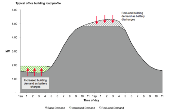 以一個(gè)典型的辦公樓的非重合的需量電費(fèi)計(jì)費(fèi)為例,其高峰需求通常在日間上午11點(diǎn)至下午5點(diǎn)之間,而在夜間使用量非常低。為了減少客戶的成本費(fèi)用,電池儲(chǔ)能系統(tǒng)可以通過(guò)電網(wǎng)在夜間充電并在日間中午放電,從而減少辦公樓的高峰需求。這與公用事業(yè)公司過(guò)去對(duì)穩(wěn)定基本負(fù)荷的需求是一致的,他們可以輕松地與火力發(fā)電廠配合使用,但不能滿足具有高水平可再生能源的系統(tǒng)的需求。而在太陽(yáng)能高度滲透的地區(qū),這樣的辦公樓實(shí)際上可能會(huì)通過(guò)減少中午的電力需求來(lái)整合太陽(yáng)能更具挑戰(zhàn)性。
