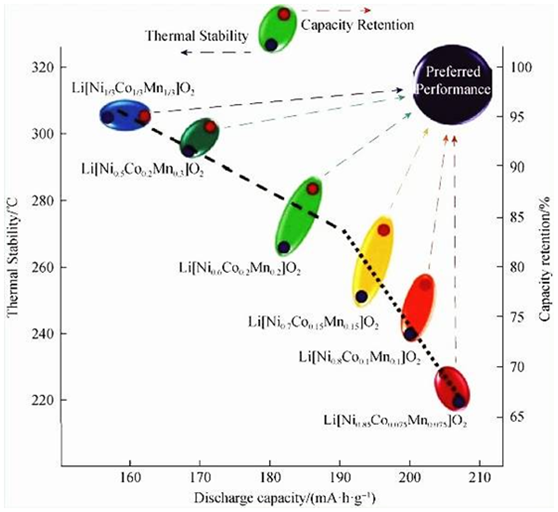 三元電池中,按照鎳、鈷、錳三者用量比例,具體可細(xì)分為111型、523型、622型和811型等。一般來說,高鎳的三元正極材料是指材料中鎳的摩爾分?jǐn)?shù)大于0.6的材料,這樣的三元材料具有高比容量和低成本的特點(diǎn)。