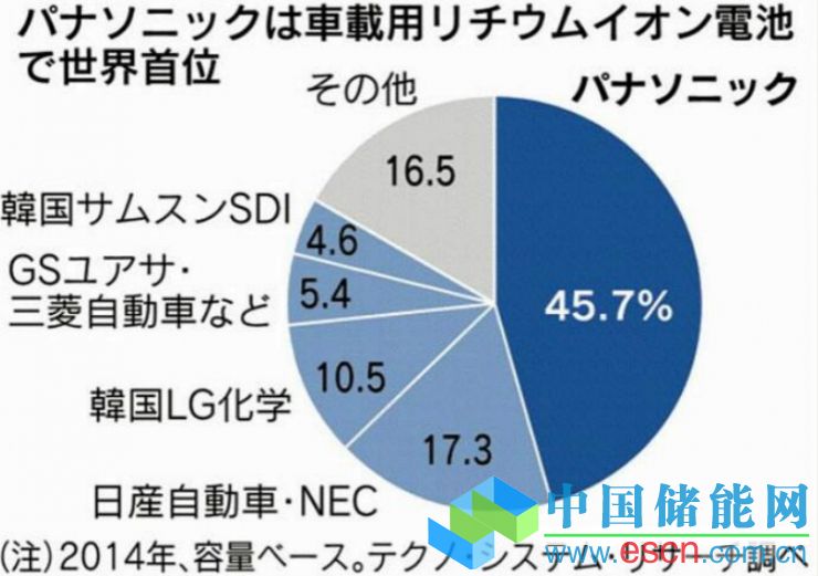 2014 年全球車用鋰離子電池,松下市場占有率達到 45.7%