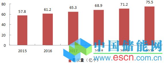 2015 至 2020 年中國鋰電池需求量預測(資料來源:智研數據中心整理)