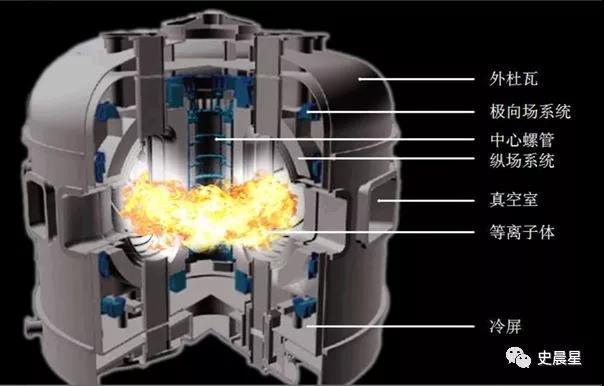 技術原理:核聚變反應堆原理是使用超高溫度將氫的同位素氘和氚加熱成等離子體,然后依靠二者的高速碰撞生產(chǎn)氦,在這一反應中會發(fā)生質量損失,而損失掉的質量就由質能方程E=mc2轉化成了巨額能量。為了束縛住反應堆中的超高溫等離子體,需要制造一個環(huán)形磁場,托卡馬克“環(huán)”因此得名。