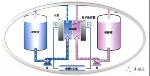 技術原理:液流電池的核心結構是被分離存儲的正負極電解液以及用于正負極電解液進行反應的電堆。在循環(huán)泵的推動下,正負極電解液流經(jīng)電堆處并發(fā)生反應,從而將化學能轉化成電能。目前最常見的液流電池為全釩液流電池。